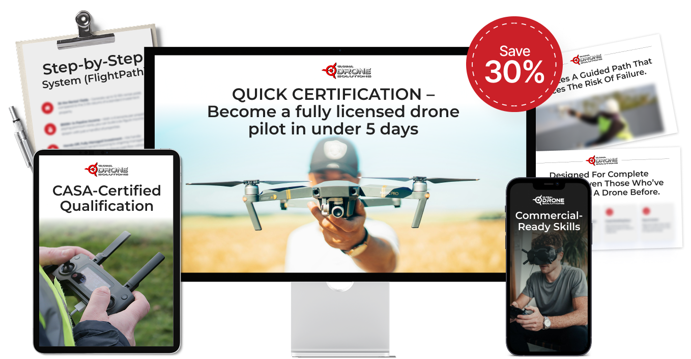 Global Drone Solutions does things differently. Our FlightPath system isn’t just a training course, it’s a complete career launchpad. You’ll go from unlicensed beginner to fully CASA-certified and job-ready in as little as 5 days, backed by real-world commercial training and the $3,000 Business Resource Kit that shows you how to quote, fly legally, and start earning.